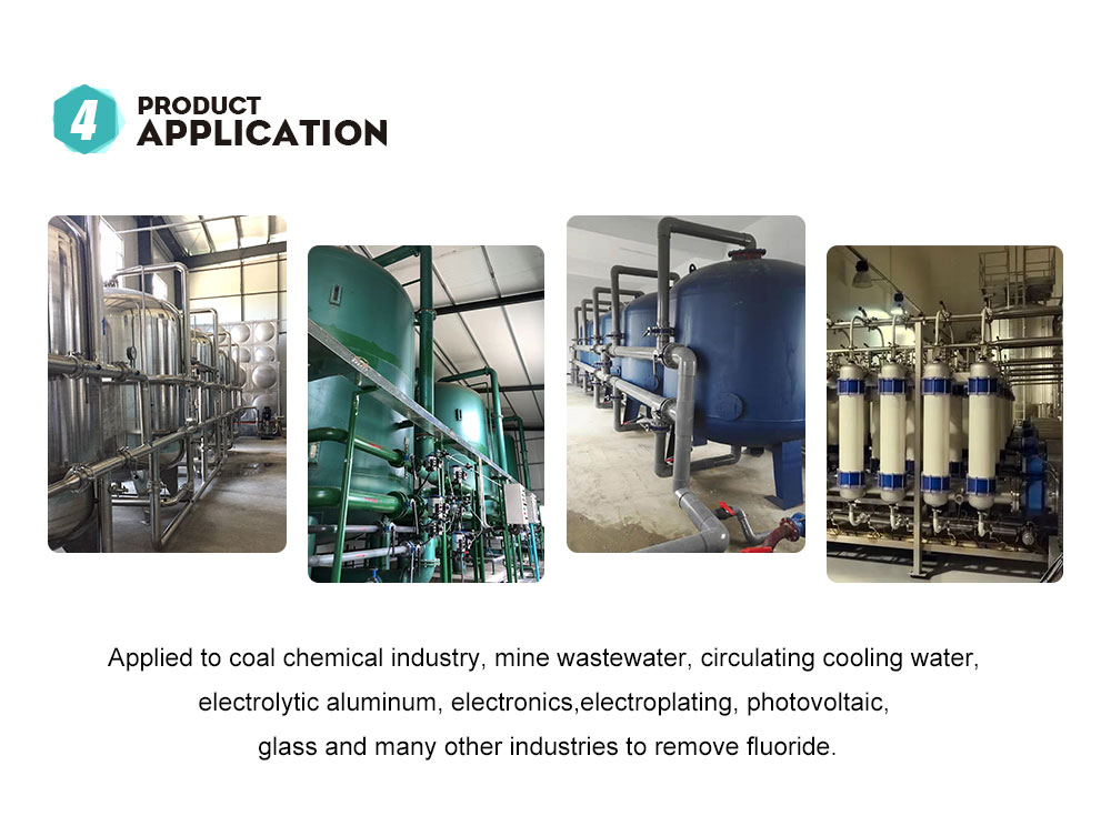 Widely used in coal chemical, mining, circulating cooling water, electrolytic aluminum, electronics, electroplating, photovoltaic, and glass industries. Notably, it meets the strict fluoride requirements of industrial "zero-discharge" projects (e.g., photovoltaic wastewater), helping enterprises achieve environmental compliance and resource recycling (reclaimed water reuse rate >99%).
