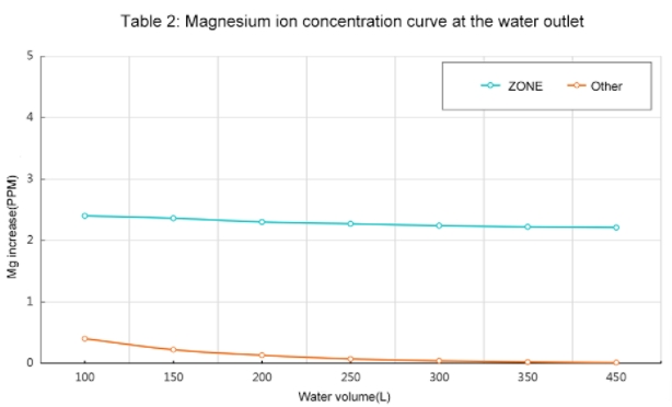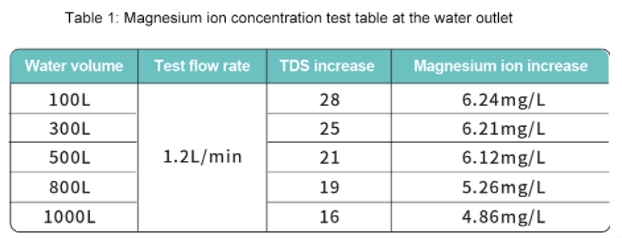 According to ZONE laboratory test data: Using RO water as the water source and under the condition of a flow rate of 1.2L/min, the T33 filter element filled with 261g of Magnesium Mineral Balls can reach a magnesium ion concentration of 6.24mg/L when the water output is 100L; even when the water output reaches 1000L, the magnesium ion concentration still remains at 4.86mg/L. This means that a filter element filled with ZONE Magnesium Mineral Balls can continuously supplement magnesium elements to the water quality during long-term use, upgrading "clean water" to "nutritious water".